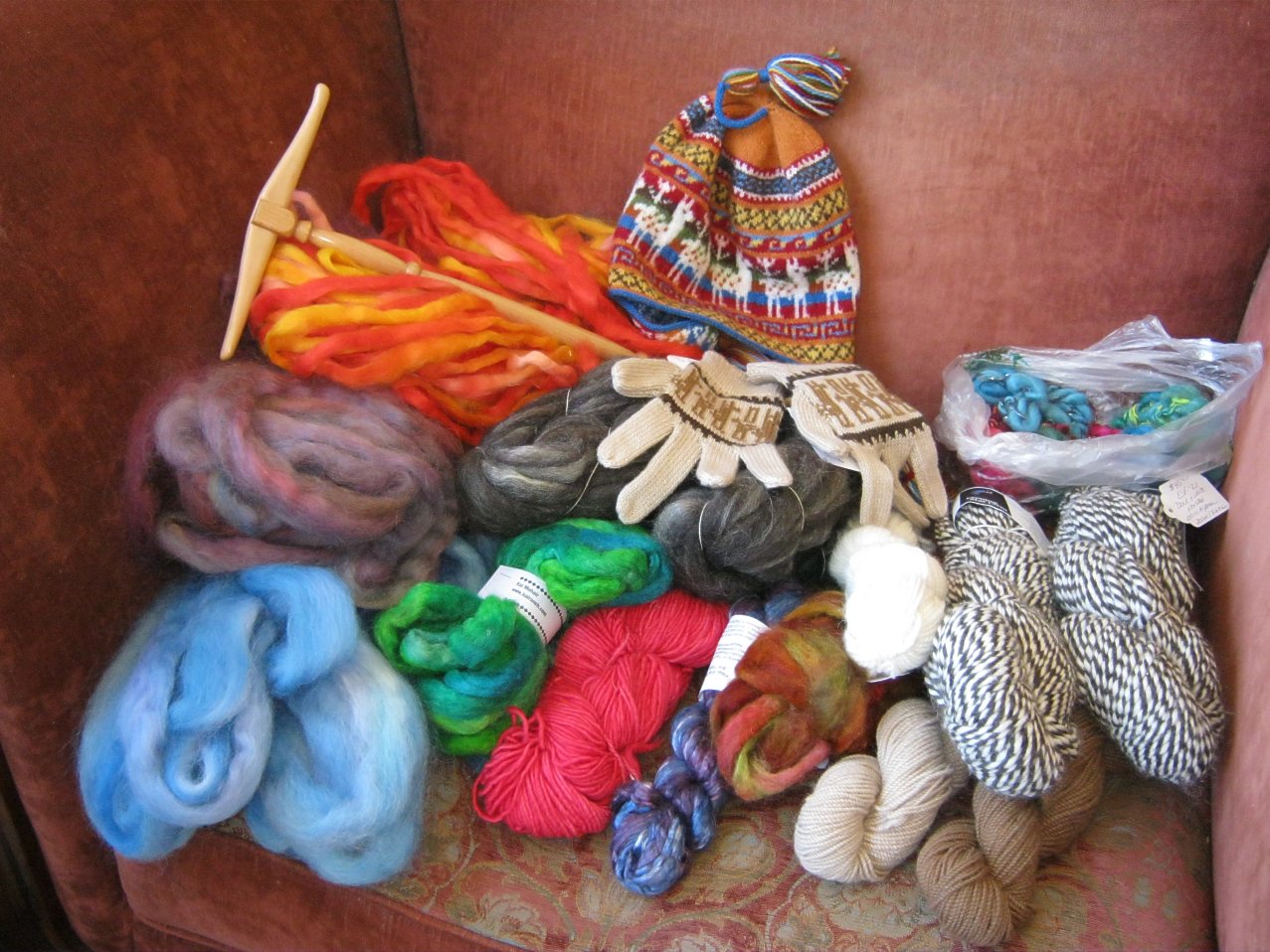 On the left, the black/white and natural shades are GLORIOUS skeins of handspun alpaca yarn. (It is so lusciously soft.... mmmmmm......) As for the other colorful stuff -- the green, orange/yellow, red/green -- all mohair roving. The purple stuff in the front is bombyx silk roving. And the center gloves are hand-knit, 100% alpaca!